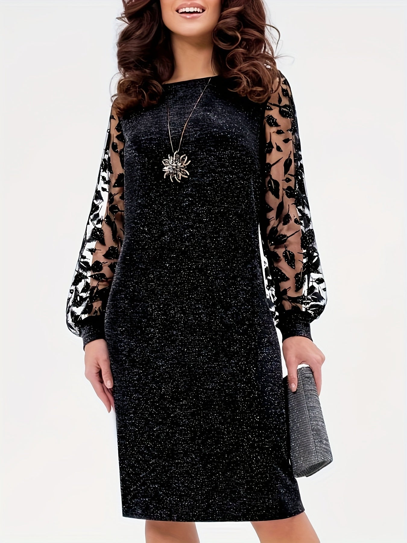 A sophisticated design that combines textured fabric with sheer, elegant mesh sleeves. The dress offers a classic fit, with a flattering silhouette that falls gracefully to knee-length. Perfect for formal events or evening cocktails, the delicate mesh details on the sleeves bring an extra touch of femininity and charm.